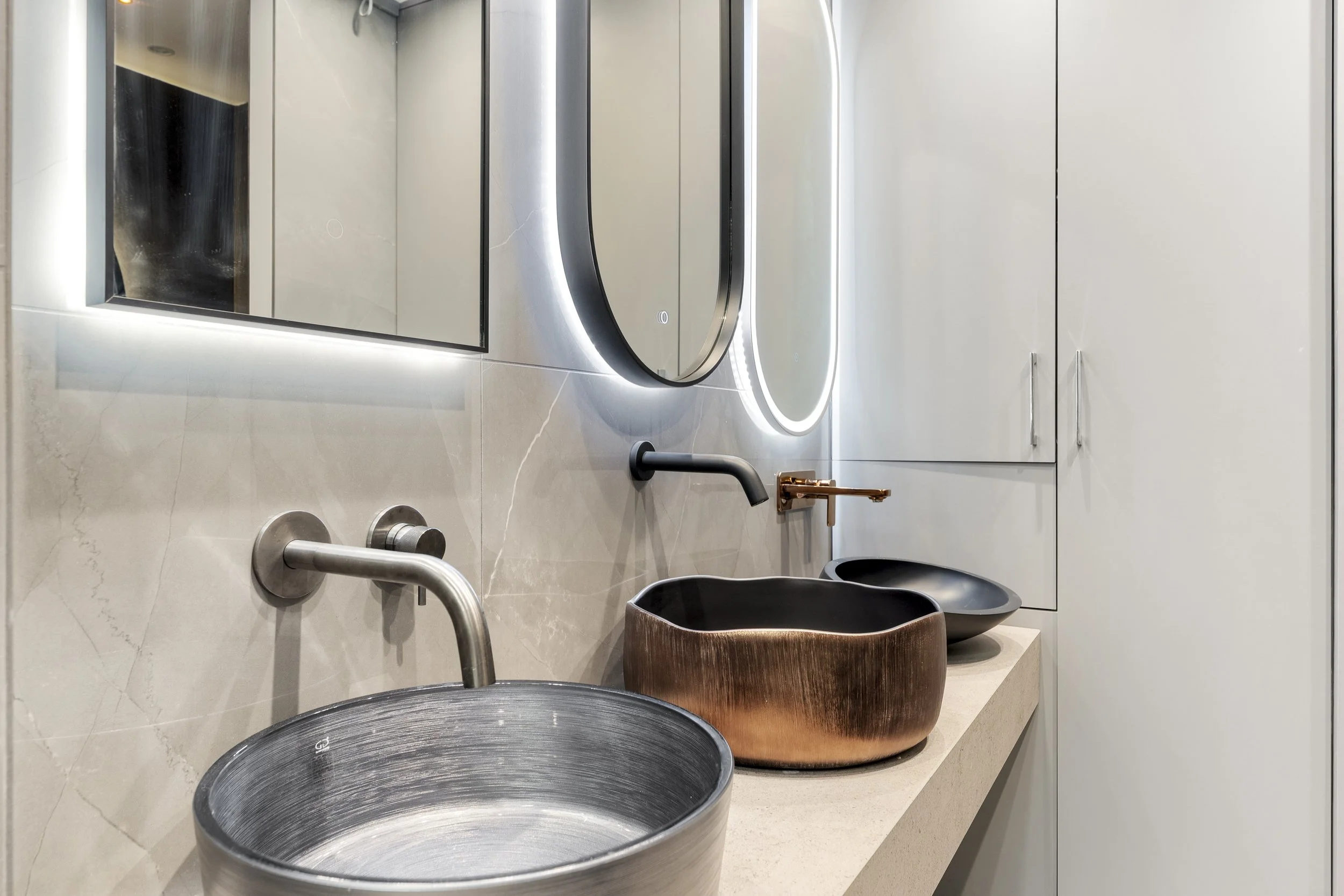 Modern bathroom with a wall-mounted mirror with LED lighting, a white sink with gold fixtures, and gold heated towel rails on a tiled wall. View fullsize